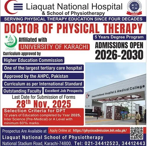 Last date to apply for Liaquat National School Of Physiotherapy LNSOP Karachi admission 2025 is 28 November, 2025