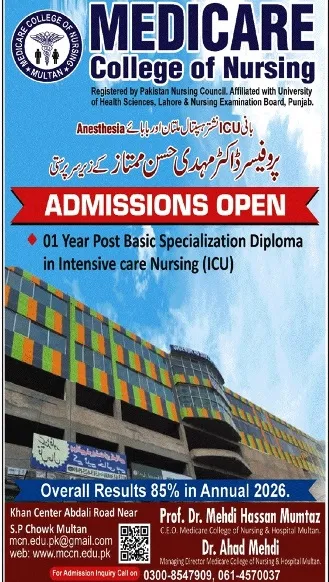 Medicare College Of Nursing MCN Multan Admission 2026 Last date
