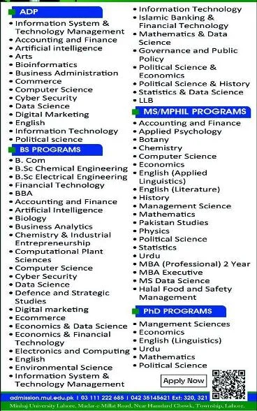 Minhaj University Lahore admission office has announced that admission are open for session 2025.