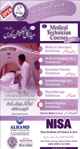 National Institute Of Science & Arts NISA Quetta Admission 2025 Last date