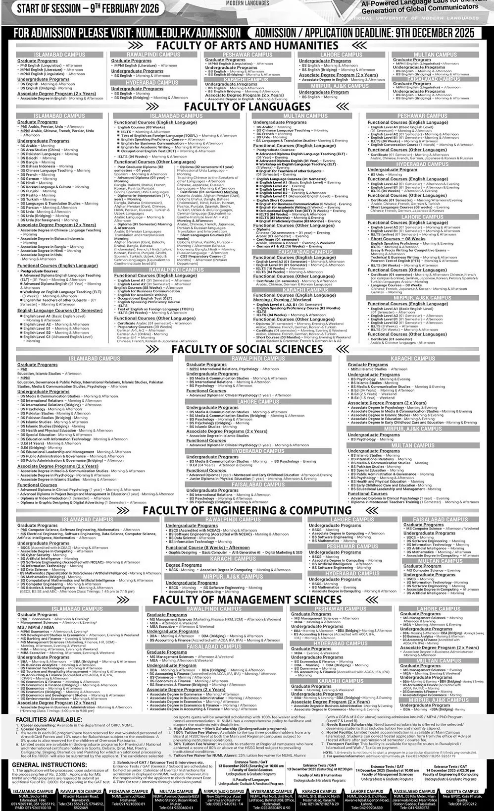 Last date to apply for National University Of Modern Languages ( Hyderabad Campus ) NUML Hyderabad admission 2025 is 09 December, 2025