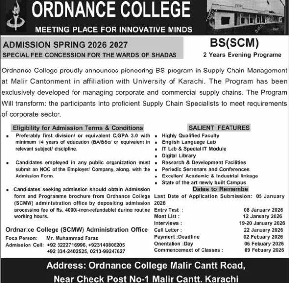 Ordinance College Karachi admission office has announced that admission are open for session 2026.