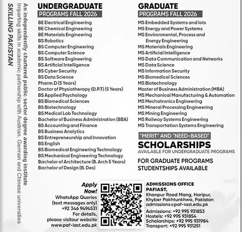 Pak- Austria Fachhuochschule, Institute Of Applied Sciences And Technology PAF-IAST Haripur Admission 2026 Last date
