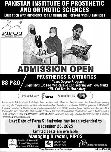Last date to apply for Pakistan Institute Of Prosthetic And Orthotic Sciences PIPOS Peshawar admission 2026 is 26 December, 2025