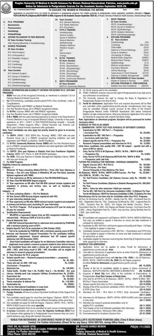 Peoples University Of Medical And Health Sciences For Women ( PUMHS) admission 2026 for PG DIPLOMA / CERT Courses / Degrees