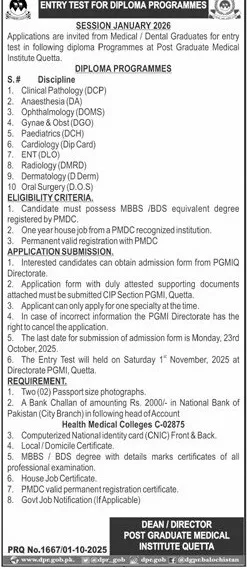Last date to apply for Post Graduate Medical Institute PGMI Quetta admission 2025 is 23 October, 2025