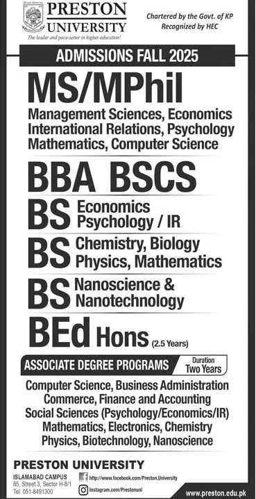 Preston University [isb] Islamabad admission office has announced that admission are open for session 2025.