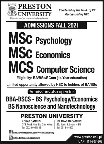 Last date to apply for Preston University [kht] PRESTON Kohat admission 2025 is 07 December, 2021