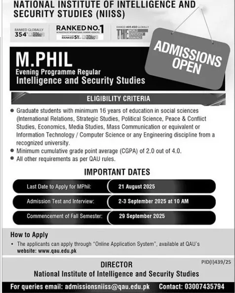 Last date to apply for Quaid-e-azam University QAU Islamabad admission 2025 is 21 August, 2025