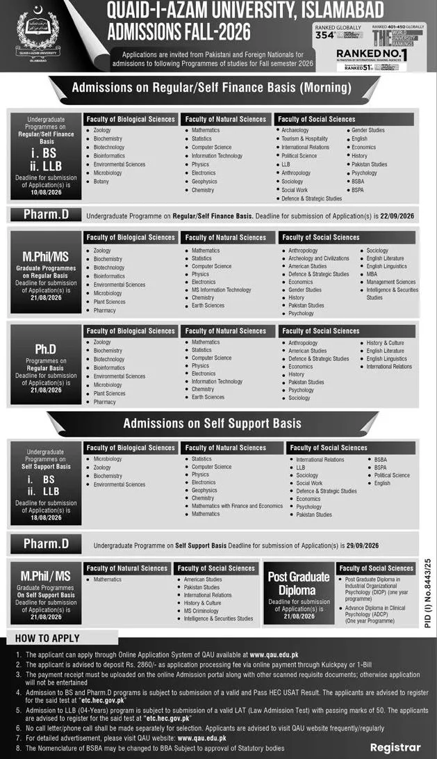How To Apply for Quaid-e-azam University Admission 2026: