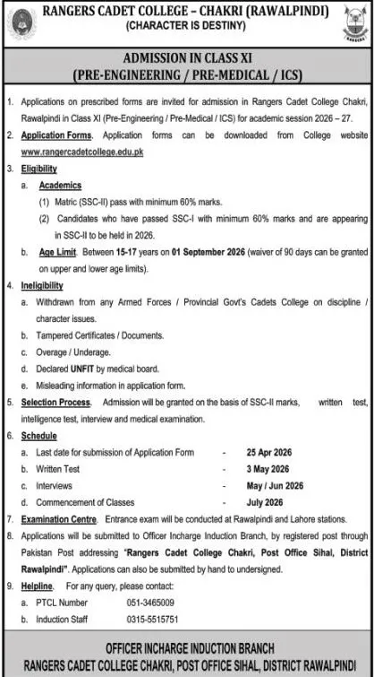 Last date to apply for Rangers Cadet College, Chakri RCC Rawalpindi admission 2026 is 25 April, 2026