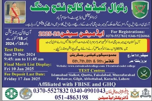 Last date to apply for Ratwal Cadet College, Ratwal RCC Fatah Jang admission 2026 is 28 December, 2024