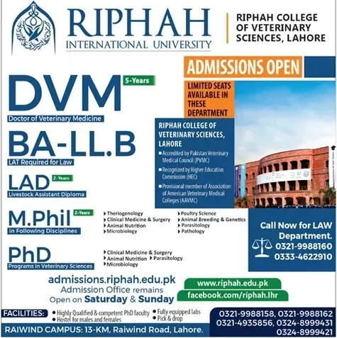 Riphah College Of Veterinary Sciences Lahore admission office has announced that admission are open for session 2025.