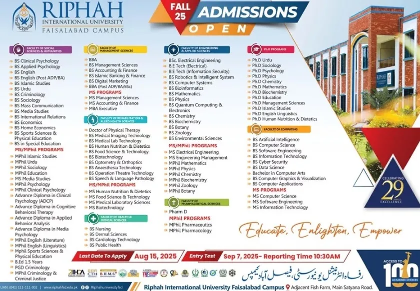 Last date to apply for Riphah International University, Faisalabad Campus RIPHAH Faisalabad admission 2025 is 15 August, 2025