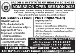 Last date to apply for Sacon Institute Of Health Sciences SIHS Lahore admission 2025 is 12 November, 2026