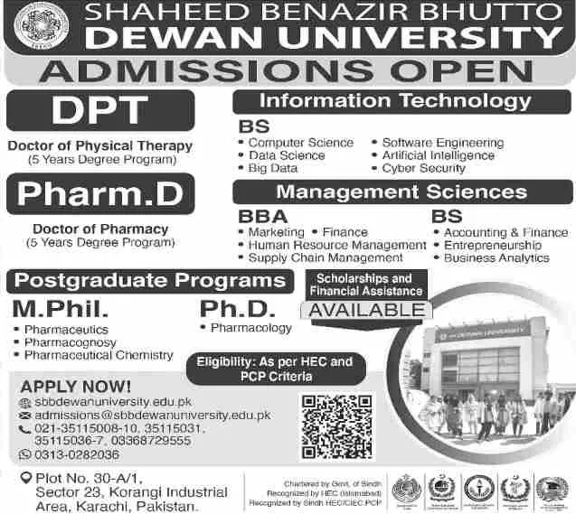 Interested applicants are informed that Shaheed Benazir Bhutto Dewan University, Karachi admission are open and you can submit the applicaiton at the earliest time.