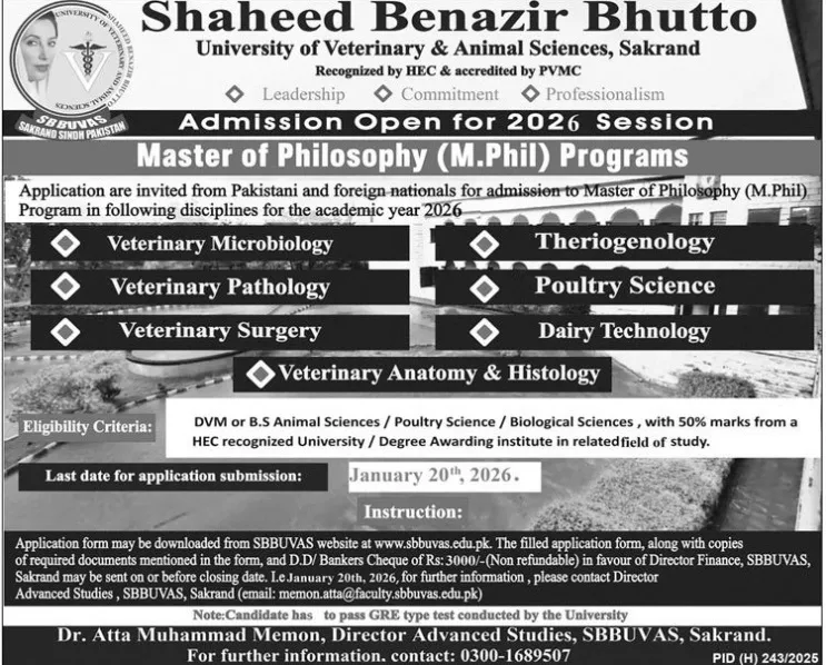 Last date to apply for Shaheed Benazir Bhutto International University Of Veterinary And Animal Sciences SBBIUVAS Sakrand admission 2026 is 20 January, 2026