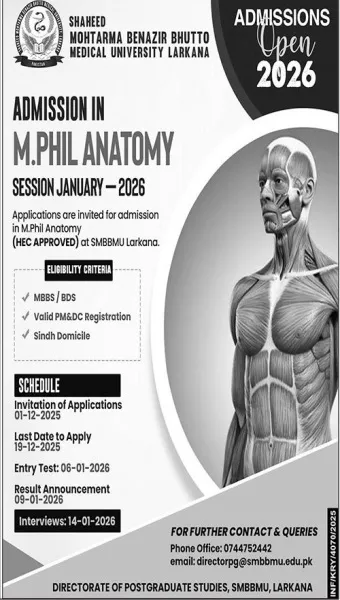 Last date to apply for Shaheed Mohtarma Benazir Bhutto Medical University SMBBMU Larkana admission 2026 is 19 December, 2025