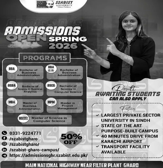 Shaheed Zulfiqar Ali Bhutto Institute Of Science & Technology SZABIST Karachi Admission 2026 Last date