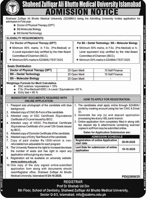 Last date to apply for Shaheed Zulfiqar Ali Bhutto Medical University, Pims SZABMU Islamabad admission 2025 is 19 October, 2025