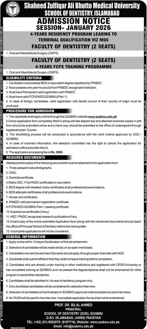 Last date to apply for Shaheed Zulfiqar Ali Bhutto Medical University, Pims SZABMU Islamabad admission 2026 is 29 January, 2026