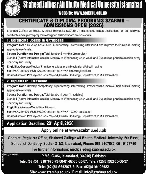 Last date to apply for Shaheed Zulfiqar Ali Bhutto Medical University, Pims SZABMU Islamabad admission 2026 is 28 April, 2026