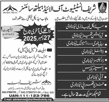 Last date to apply for Sharif Institute Of Allied Health Sciences SIAHS Lahore admission 2025 is 27 December, 2025