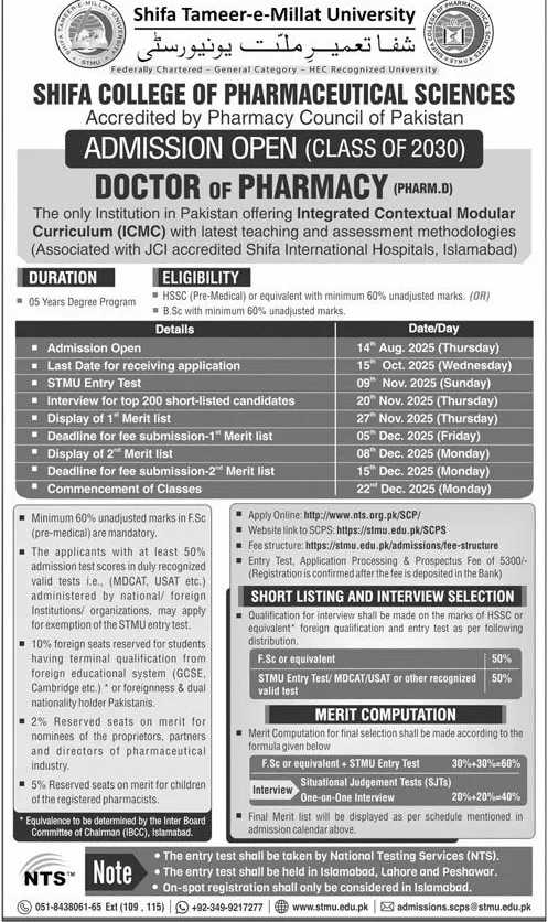 Last date to apply for Shifa Tameer-e-millat University STMU Islamabad admission 2025 is 15 October, 2025