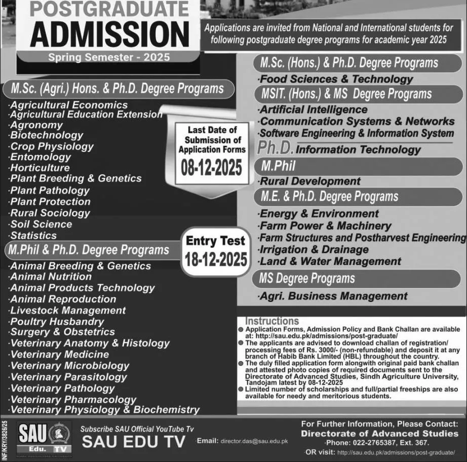 Last date to apply for Sindh Agriculture University SAU Tando Jam admission 2026 is 08 December, 2025