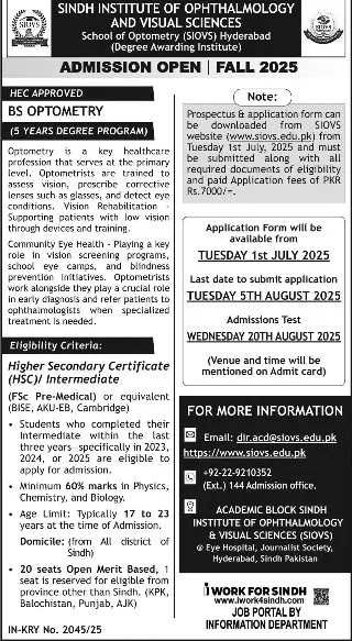 Sindh Institute Of Ophthalmology & Visual Sciences SIOVS Hyderabad Admission 2025 Last date