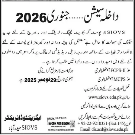 Last date to apply for Sindh Institute Of Ophthalmology & Visual Sciences SIOVS Hyderabad admission 2025 is 29 November, 2025
