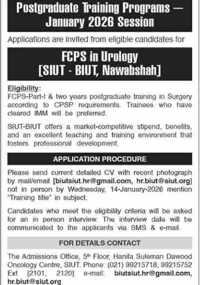 Last date to apply for Sindh Institute Of Urology And Transplantation SIUT Karachi admission 2026 is 14 January, 2026