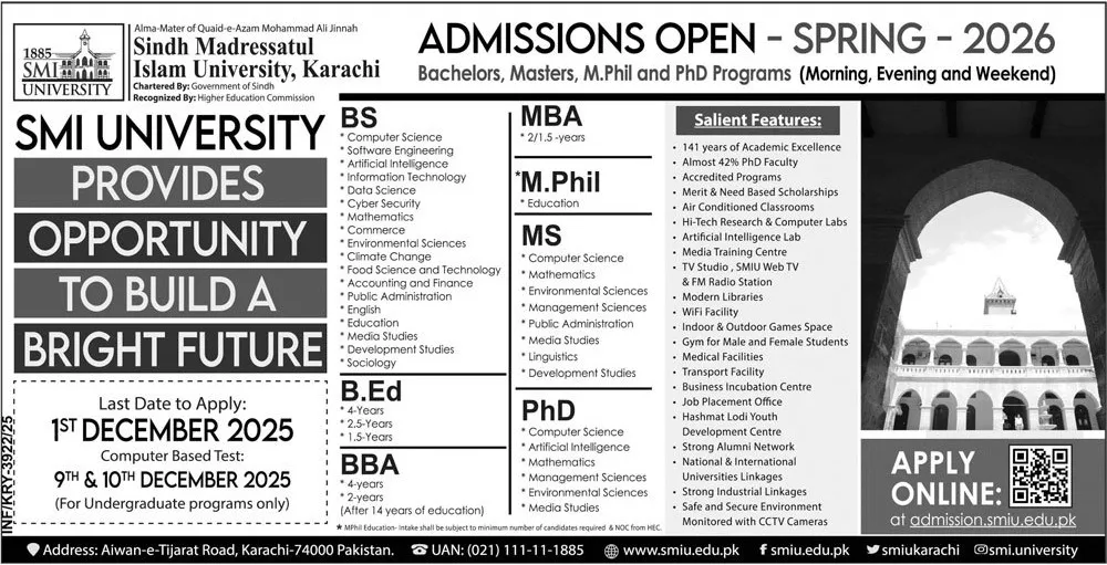 Last date to apply for Sindh Madressatul Islam University SMIU Karachi admission 2025 is 01 December, 2025