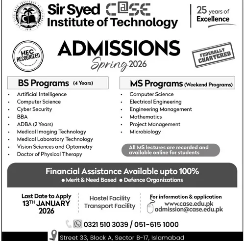 Last date to apply for Sir Syed Case Institute Of Technology CASE Islamabad admission 2026 is 13 January, 2026