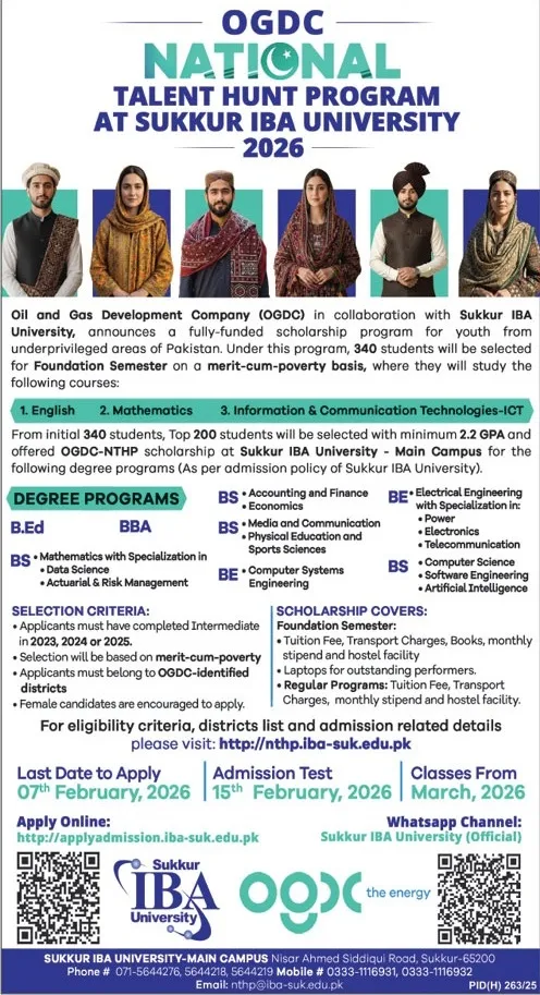 Last date to apply for Sukkur Iba University SIBAU Sukkur admission 2026 is 07 February, 2026