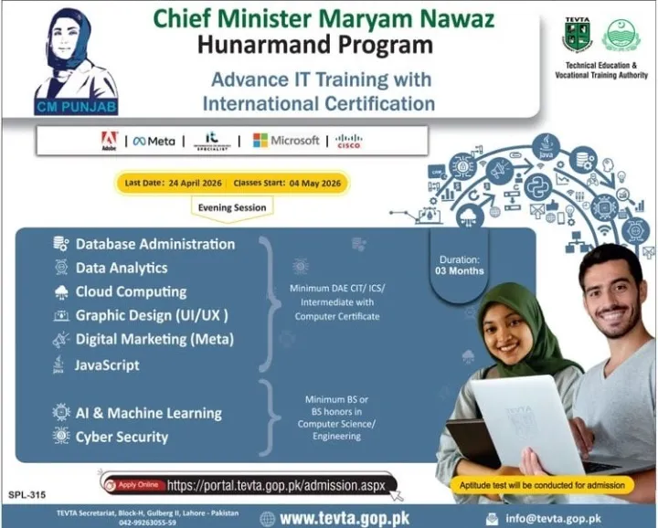 Last date to apply for Technical Education And Vocational Training Authority Punjab TEVTA Lahore admission 2026 is 24 April, 2026