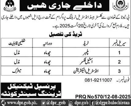 Last date to apply for Technical Training Centre TTC Quetta admission 2025 is 20 August, 2025