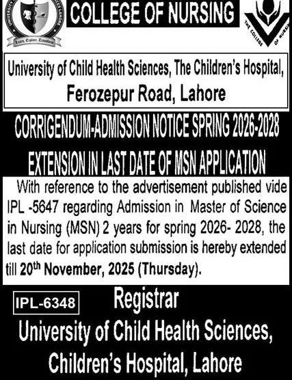 Last date to apply for The Childrens Hospital & The Institute Of Child Health Lahore admission 2025 is 20 November, 2025