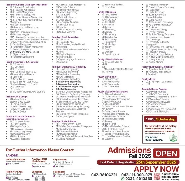 Last date to apply for The Superior University SPU Lahore admission 2025 is 25 September, 2025