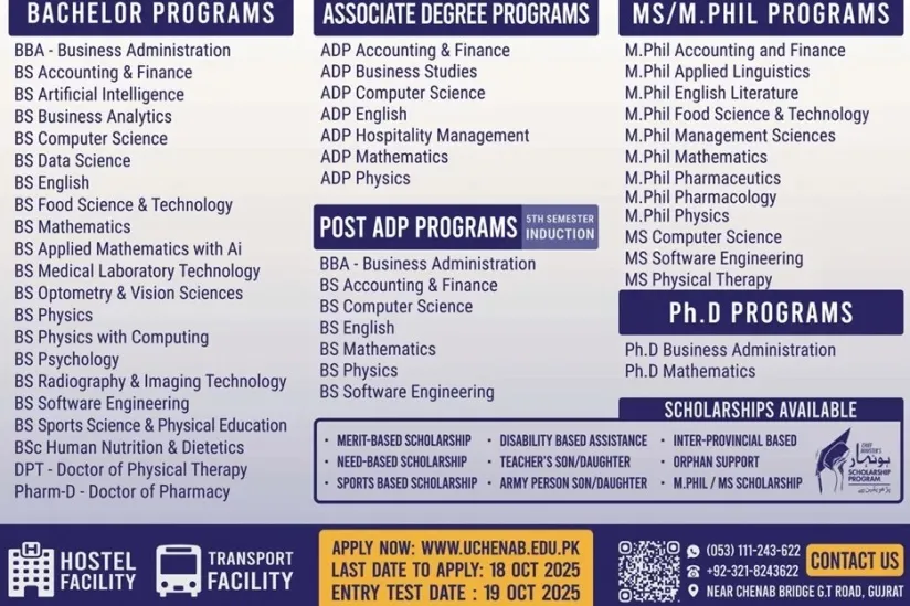 Last date to apply for The University Of Chenab UCHENAB Gujrat admission 2025 is 18 October, 2025