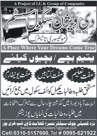 Interested applicants are informed that The Vision School & College Of Sciences, Abbottabad admission are open and you can submit the applicaiton at the earliest time.