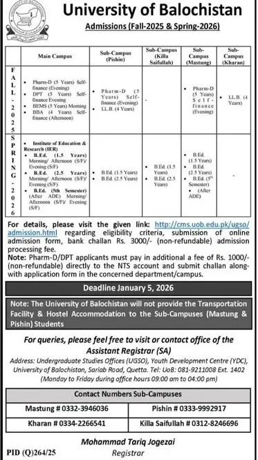 Last date to apply for University Of Balochistan UOB Quetta admission 2026 is 05 January, 2026
