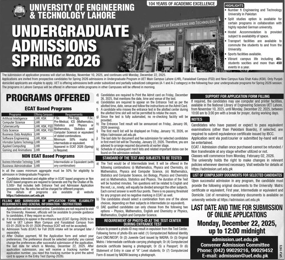 Last date to apply for University Of Engineering And Technology[fiasalabad Campus] UET Faisalabad admission 2025 is 22 December, 2025