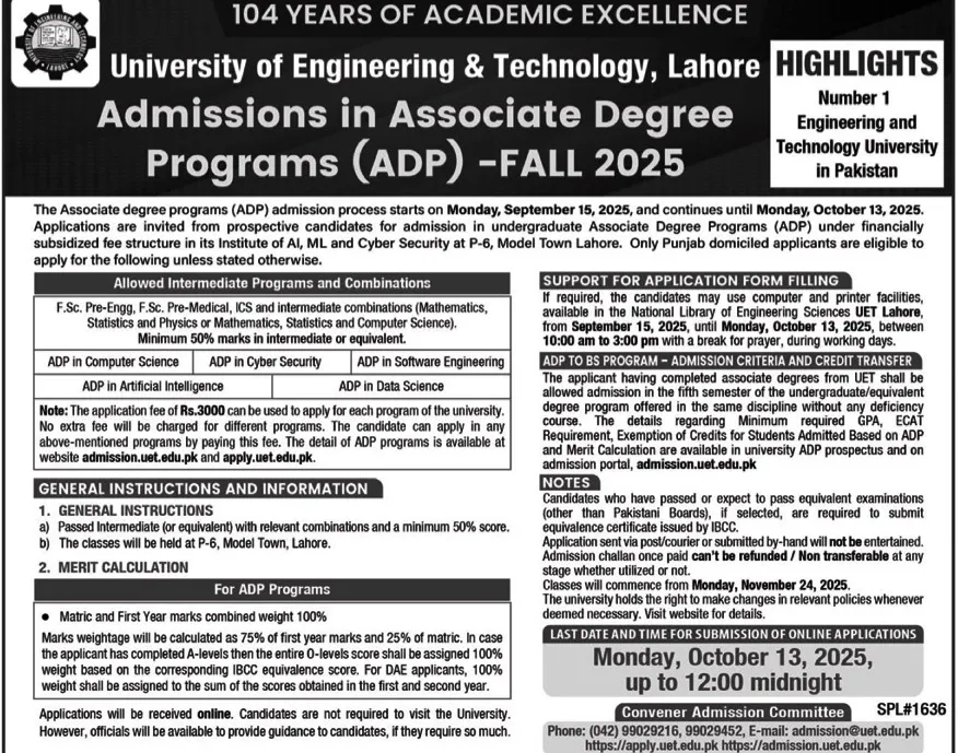 Last date to apply for University Of Engineering & Technology, Lahore UET Lahore admission 2025 is 13 October, 2025