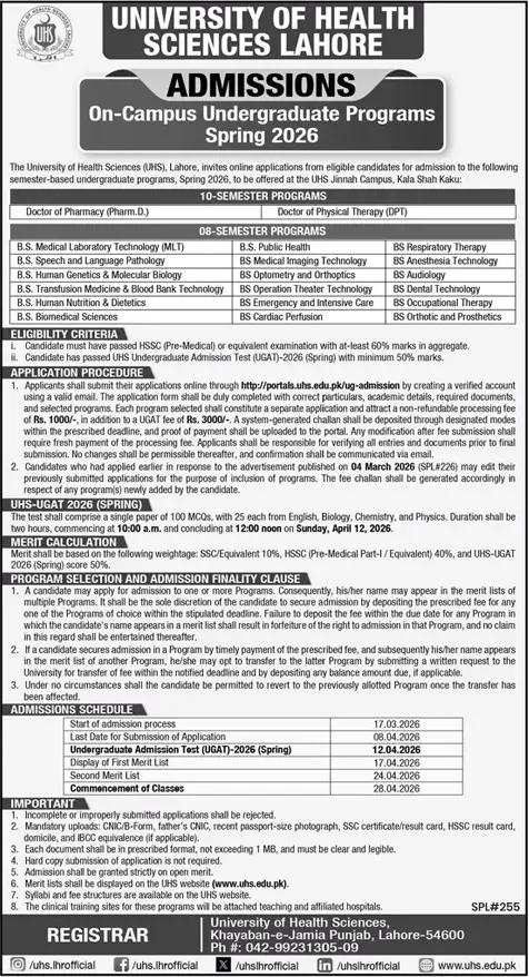 Last date to apply for University Of Health Sciences UHS Lahore admission 2026 is 08 April, 2026