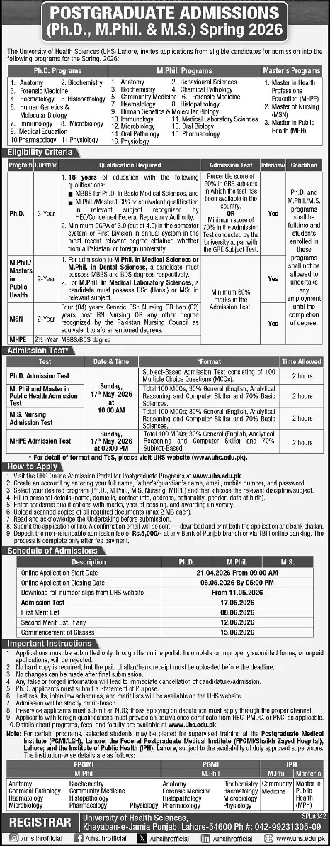 University Of Health Sciences UHS Lahore Admission 2026 Last date