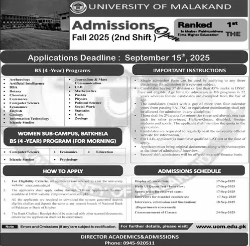 Last date to apply for University Of Malakand UOM Chakdara admission 2025 is 15 September, 2025