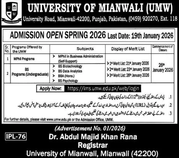 Last date to apply for University Of Mianwali UOM Mianwali admission 2026 is 19 January, 2026