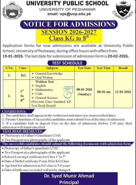 University Public School Peshawar admission office has announced that admission are open for session 2026.