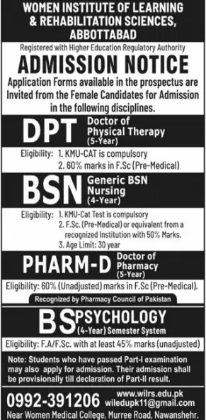 Women Institute Of Rehabilitation Sciences Abbottabad admission office has announced that admission are open for session 2026.